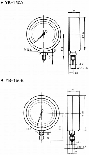 YB-150A型在标度线下设有镜面环,使仪表读数更清晰准确,外形美观新颖。准确度为0.4级。